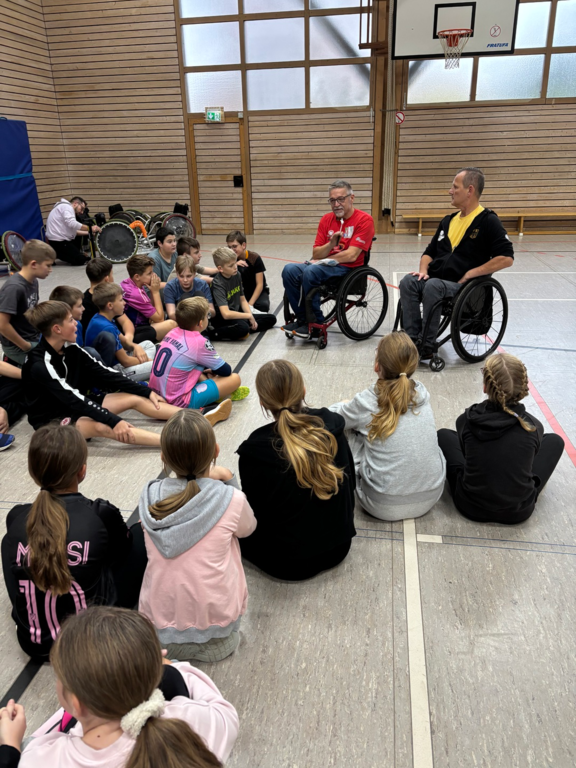 Bevor jedoch die Rollstühle unter fachkundiger Anleitung zusammengebaut und ausprobiert werden durften, bekamen Kinder und Lehrkräfte einen offenen Einblick in das Alltagsleben im Rollstuhl. Ergreifend ehrlich erzählten die bereits in ihrer Jugend verunfallten Rollstuhlfahrer Christoph Werner, heutiger Cheftrainer der Rollstuhl-Rugby-Nationalmannschaft und Jörg Holzem, ehemaliger Forstwirt und heute Fachwart für Rollstuhl-Rugby, ihre persönliche Geschichte. Ihm sei beim Fällen ein Baum auf den Körper gefallen, berichtet Holzem und erklärt, dass nach mehreren lebensrettenden Operationen Wohnhaus und Auto behindertengerecht umgebaut werden mussten. Auch sei es nicht nur für ihn selbst, sondern auch für seine Familie zunächst sehr schwierig gewesen, die Behinderung zu akzeptieren. Fröhlich erklärt er, dass er und seine damalige Freundin trotz der Umstände geheiratet und eine Familie gegründet hätten. Die meisten „Rugby-Roller“ seien übrigens durch einen Sprung in zu flaches Wasser gelähmt, ergänzt er freimütig. Gespannt lauschten die Kinder als Christoph Werner die Funktion der Wirbelsäule und den Begriff Querschnittslähmung erläuterte. Erstaunte Gesichter als klar wurde, dass dabei nicht nur die Beine gelähmt, sondern häufig auch zu unterschiedlichen Anteilen die Funktion von Armen, Fingern und Oberkörpermuskulatur eingeschränkt sei. Wenn ein Rollstuhlfahrer Hilfe brauche, so Holzem, müsse er in der Lage sein, eine punktgenaue Anweisung zu geben, sonst könne es gehörig schiefgehen. Cheftrainer Werner ergänzt, dass ein freundlicher „Helfer“ seinen Rollstuhl einmal wie eine Schubkarre angehoben und ihn so versehentlich aus dem Rollstuhl gekippt habe.