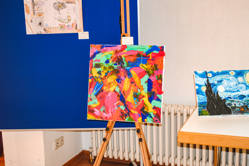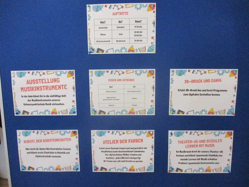 Im Chemieraum knallte und brodelte es bei naturwissenschaftlichen Experimenten, während in Biologie die Welt unter dem Mikroskop erkundet wurde. Moderne Technik zum Anfassen gab es in Arbeitslehre: am Computer konnte Grafikdesign ausprobiert werden, ein 3D-Drucker verrichtete seine Arbeit, LEGO-Roboter wurden zum Leben erweckt und programmierbare Roboter drehten ihre Runden. Kreative Köpfe kamen beim Atelier der Farben und der Wichtelwerkstatt auf ihre Kosten. Im Musikraum wurde eifrig an Instrumenten ausprobiert. Die Theater-AG stellte sich vor. Instrumente wurden ausgestellt, und das Bläserorchester gab mehrere Proben seines Könnens. Digitales Lernen wurde mit iPads, Whiteboard und einem selbst erstellten FPS-Kahoot-Quiz demonstriert. Auf dem Schulhof fanden Jumpstyle-Vorführugen statt. Kulinarische Highlights bot die Schulküche mit leckerem Finger Food. Dazu gab es Würstchen vom Holzkohlegrill, Kaffee, kalte Getränke und selbstgebackenen Kuchen.