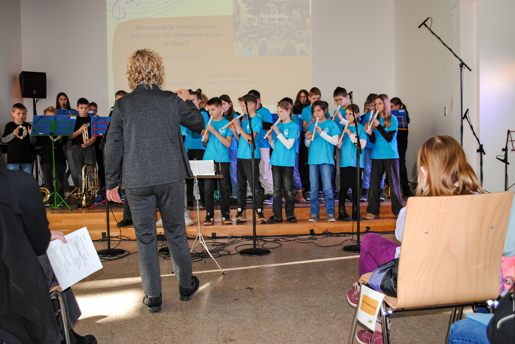 Die Reden wurden mit Bläserstücken der Orchester-AG unter der Leitung von Heike Schlicht umrahmt. Musikalischer Höhepunkt war der Fritz-Philippi-Song, bei dem viele Kinder mit Bewegungen und Tanz zum Mitmachen animiert wurden.