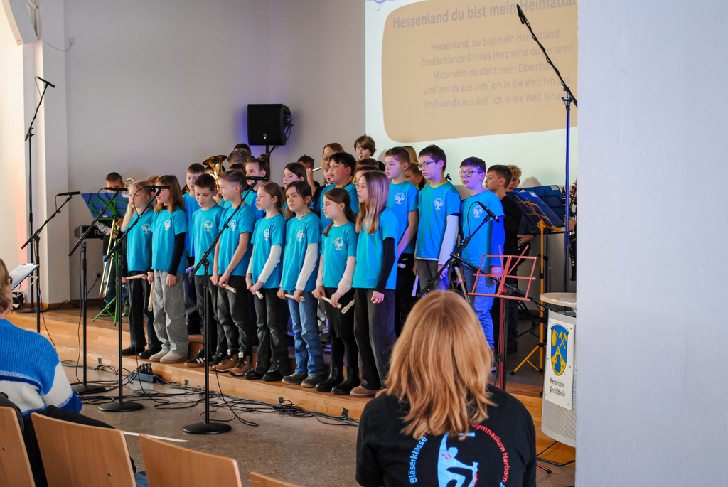 Ein Heimspiel hatte dann das Bläserensemble der Fritz-Philippi-Schule mit der vierten Klasse und im Anschluss die Bläserband der Sekundarstufe. Mit der zweiten Auflage des „Recorder Rocks“ zeigten die 20 Bläser des Bläserensembles und 25 Blockflötenspieler der Klasse 4, dass sie als Auswahlschule für das Blockflötenprojekt der Landesregierung bestens geeignet sind. Danach folgte der eigens für die Teilnahme an der Ausschreibung des Kultusministeriums „80 Jahre Hessen“ von Heike Schlicht komponierte „Hessen-Geburtstagsrap“. Eine Zusammensetzung aus traditionellem Volkslied und Rap, bei dem im Refrain das Publikum zum Mitsingen und Klatschen animiert wurde. Die Bläserband der Sekundarstufe unter Leitung von Tobias Müller überzeugte professionell im Anschluss mit Titeln wie „Bad Guy“, „Stand by me“ und „Happy“. Ein weiterer Beweis dafür, dass die an dieser Schule geleistete musikalische Ensemble-Aufbauarbeit und Kooperation Früchte trägt.