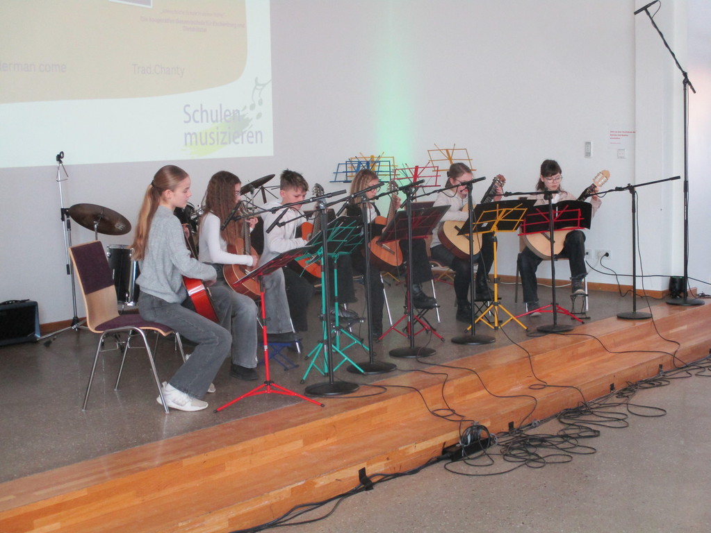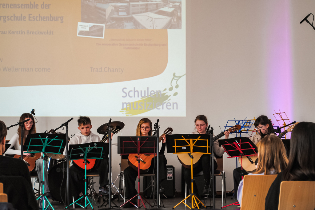 Das Gitarrenensemble der Holderbergschule aus Eschenburg bot mit eindrucksvoller Harmonie und rhythmischer Sicherheit die Titel „The foggy dew“ und den „Wellerman“. Bemerkenswert war hier auch die wertschätzende Aufmerksamkeit des Publikums. Mit toll abgemischter Mikrophonverstärkung der Firma Lahn Ton mit Harald Frimmel, der die Veranstaltung professionell beschallungstechnisch betreute, konnte man sich bei den wunderbaren Gitarrenklängen entspannt zurücklehnen.