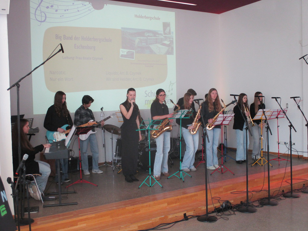 Die Big Band der Holderbergschule Eschenburg unter der Leitung von Beate Czymek zeigte dann mit den Titeln „Narcotic“ und „Nur ein Wort“ mit solistischen Gesangseinlagen, wie vielseitig an dieser Schule musikalische Arbeit geleistet wird.