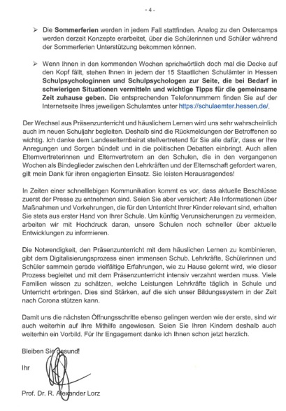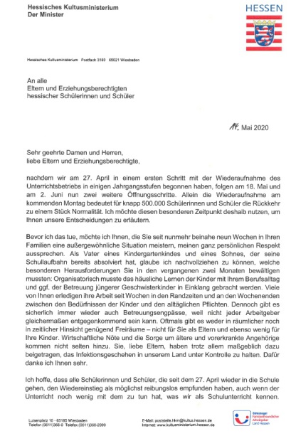 unten sehen Sie einen Brief des Hessischen Kultusministers an alle Eltern und Erziehungsberechtigten hessischer Schülerinnen und Schüler: