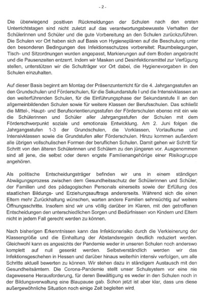 Der Eilantrag einer Schülerin an den Verwaltungsgerichtshof (VGH) Kassel wurde zurückgezogen, damit sind alle Informationen im unten stehenden Brief (auch in Bezug auf die vierte Klassenstufe) bestätigt und ab Montag (18.05.2020) gültig.